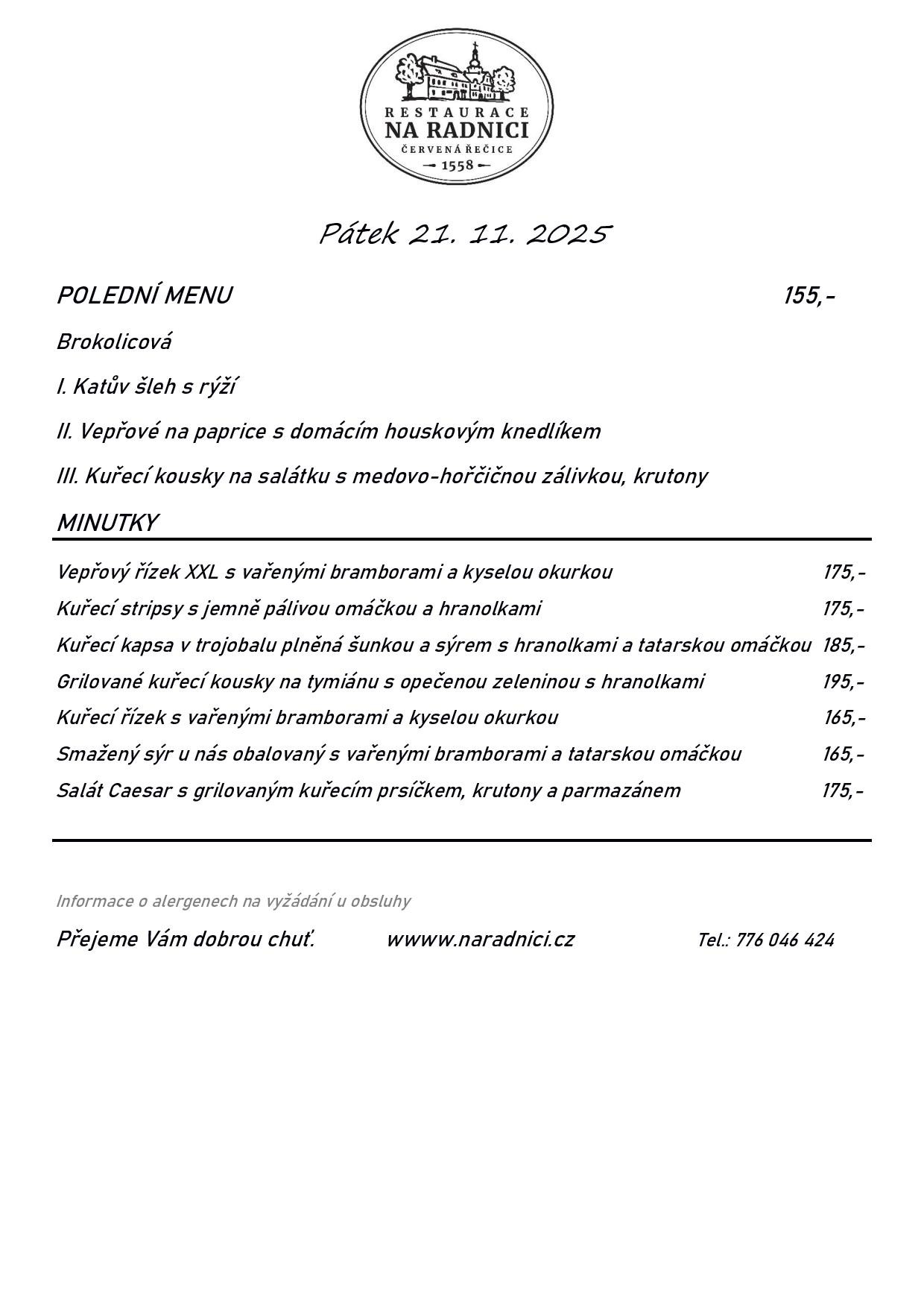 V této sekci naleznete polední meníčka nabízená přímo v restauraci. Pro nabídku rozvozu jídla do Pelhřimova a Humpolce klikněte zde. Objednávky nebo Vaše případné dotazy rádi vyřídíme na tel. čísle 776 046 424 či na e-mailu rozvoz@naradnici.cz